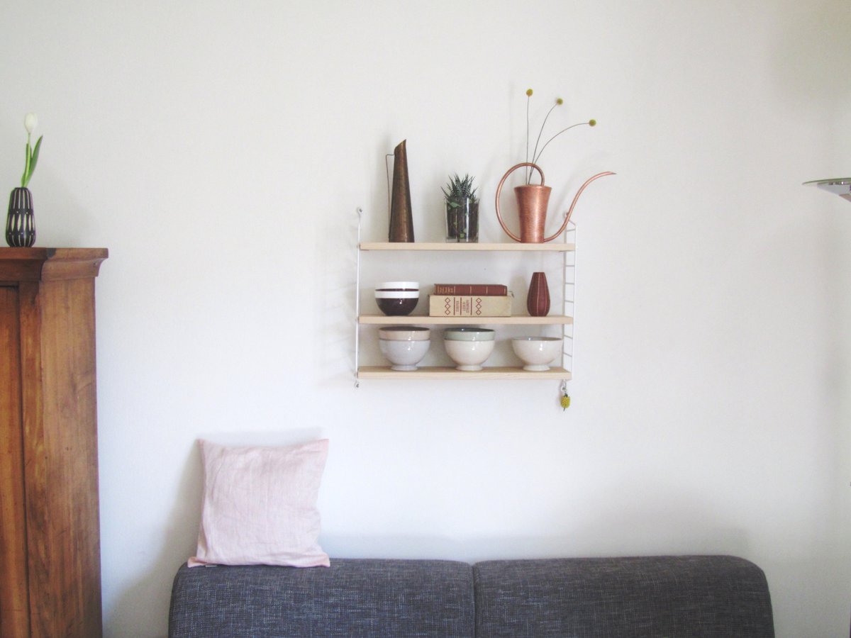 Wohnzimmer, String Pocket Regal, Kupfer, Vasen, Schalen, Bücher, Sukkulent, Schrank alt, Kissen rosa