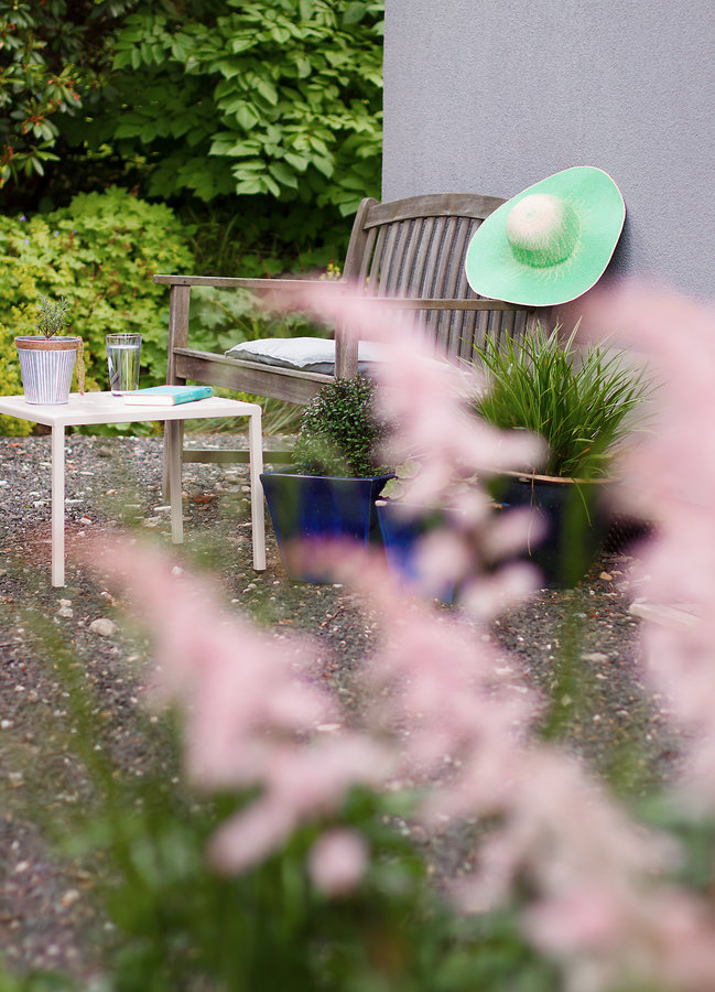 Fast Sommer, Schattenplatz, Vor dem haus, Holzbank, Sonnenhut, Astilben