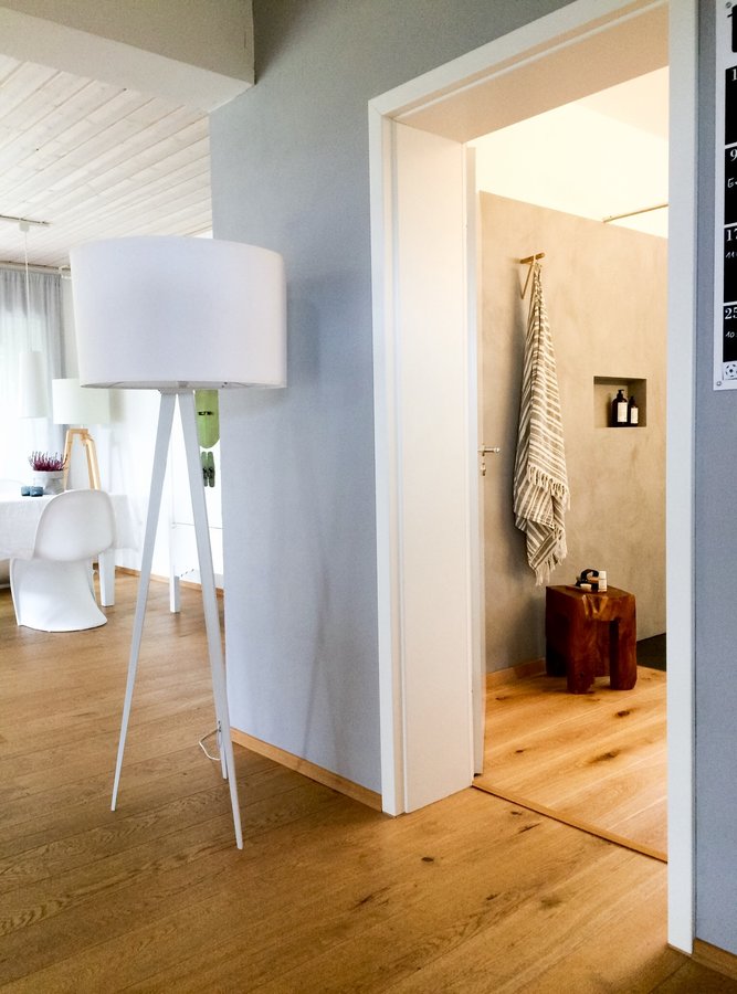 Bad, Beton Ciré, Altholzhocker, Wandfarbe Nebel im November, Badezimmer