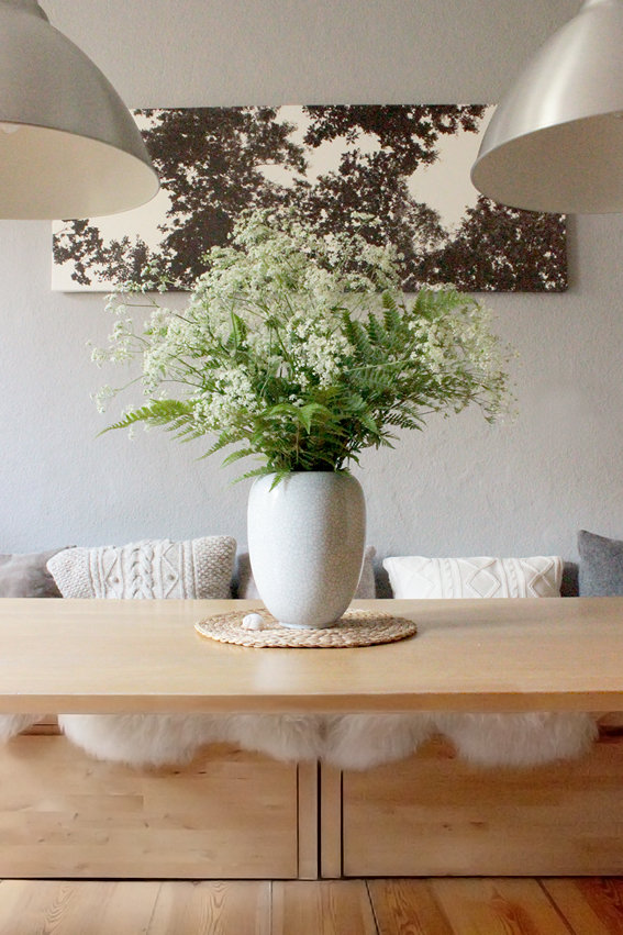 Wilde Möhre, Tisch im späten Frühling, Farn, birke, Holz, Schaffell, Helles Holz, Skandinavisch