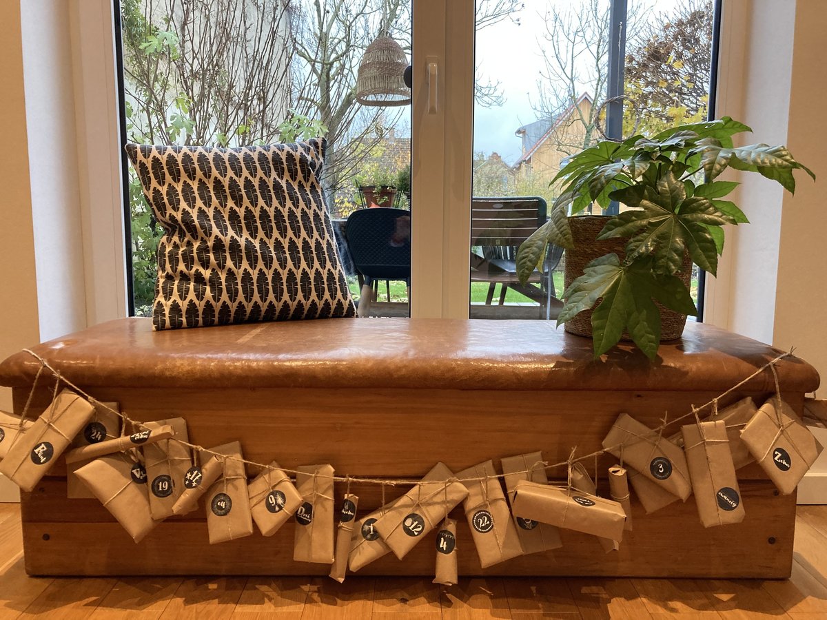 Was für eine tolle Überraschung! Mein Mann hat heute Nacht einen Adventskalender an unseren Turnkasten/Sitzbank gehängt. Ich freu mich so!
