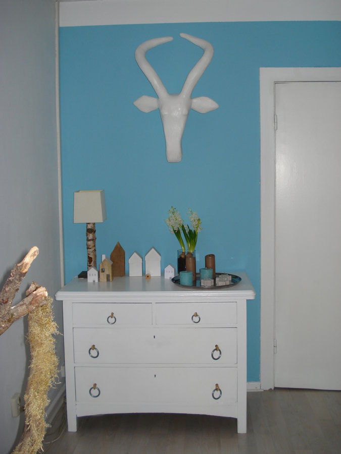 Weiße Kommode, Türkise Wand, Tiertrophäe, Dekohäuser