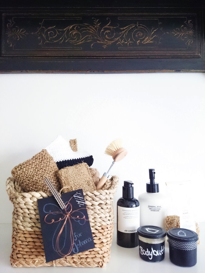 Vor allem die schönen DIY-Geschenke meiner Schwester haben es mir besonders angetan. Von ihr sind u.a. die selbstgemachten Döschen mit DIY-Bodybutter und Gesichtscreme, die selbstgestrickten Spülschwämmchen aus Naturkordel sowie zwei zauberhafte selbstgehäkelte Topflappen in Häuschenform.