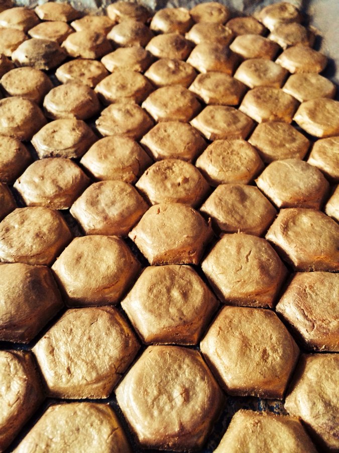 Ich habe ein neues Rezept für kalorienarme Plätzchen ausprobiert. Leider war der Teig so klebrig, dass keine Weihnachtsform etwas werden wollte, also habe ich kurzerhand den Ravioli- Stanzer von meiner Mutter genommen, den ich eigentlich als Topfuntersetzer nutze.