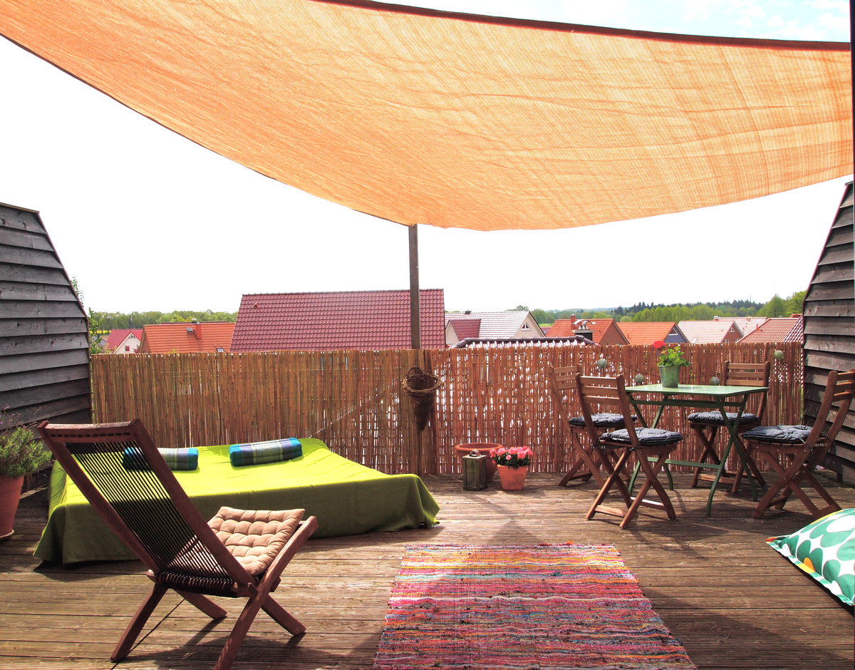 ... habe ich das Sonnensegel aufgehängt, der Liege ein grünes Kleid gegeben,Sitzsäcke rausgebracht, den Teppich ausgerollt... Jetzt fehlen nur noch ein paar große Grünpflanzen und dann könnte der Sommer gerne bleiben...