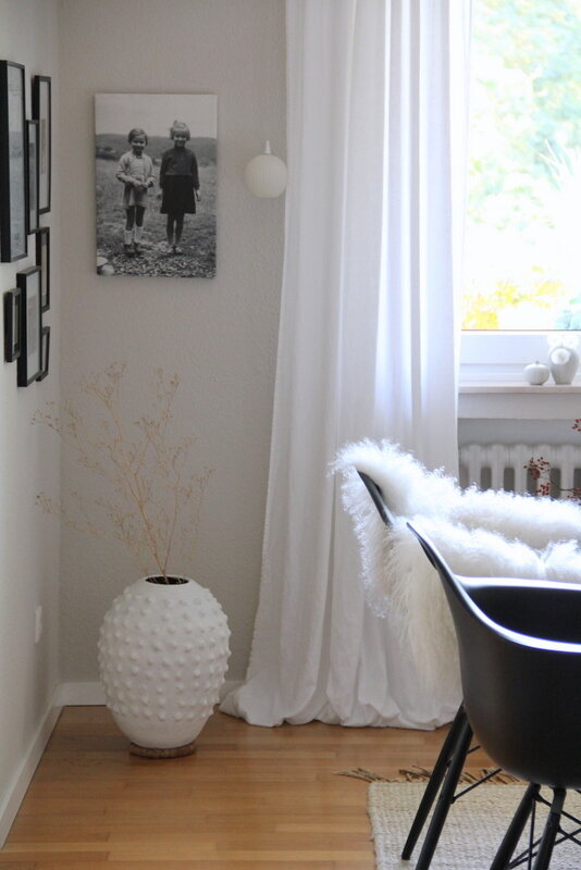 Esszimmerecke, Bodenvase, Bilderwand, Leinestore, Stühle