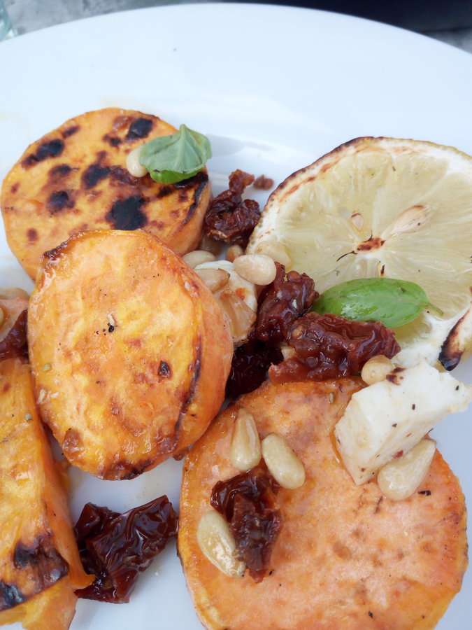 Süßkartoffeln und Zitronen vom Grill mit einer gebratenen Marinade aus Knoblauch, Zitrone, Olivenöl,Agavensaft und getrockneten Tomaten ☺️