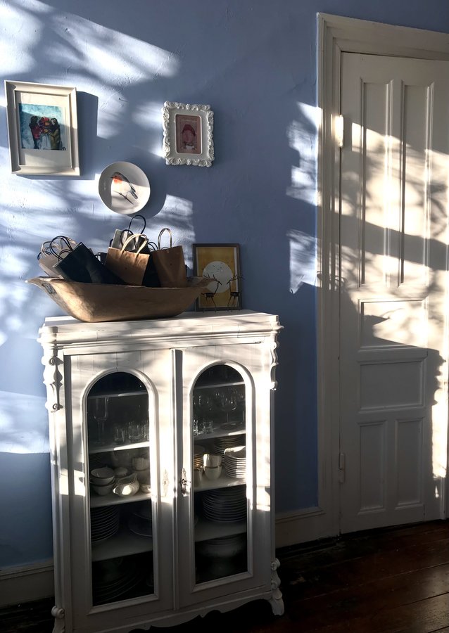 Adventskalender, Esszimmer, Wandfarbe blau, Wintersonne, Biedermeier, Schränkchen, futtertrog