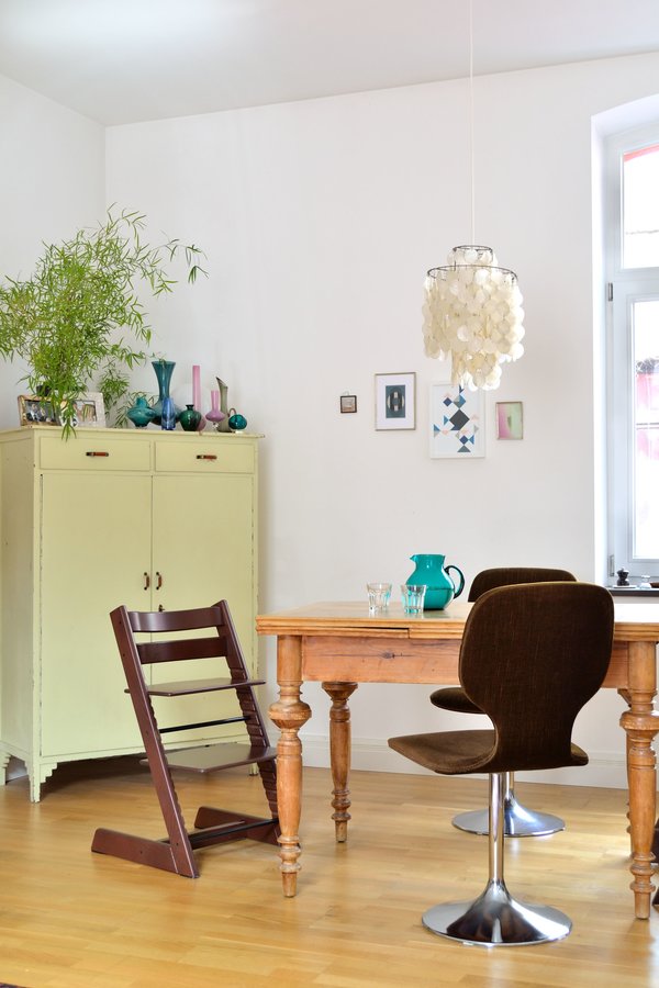 Essecke im Wohnzimmer, Essplatz im Wohnzimmer, Stokke Tripp Trapp, Tulpenfußstühle, 70er Jahre Stühle, Weichholztisch, Altes Vertiko, Muschellampe, Stilmix, blau grün, Glasvasen alt, Glasvasensammlung, Asparagus, Aquatöne, Bilderwand, Thonet Wettbewerb