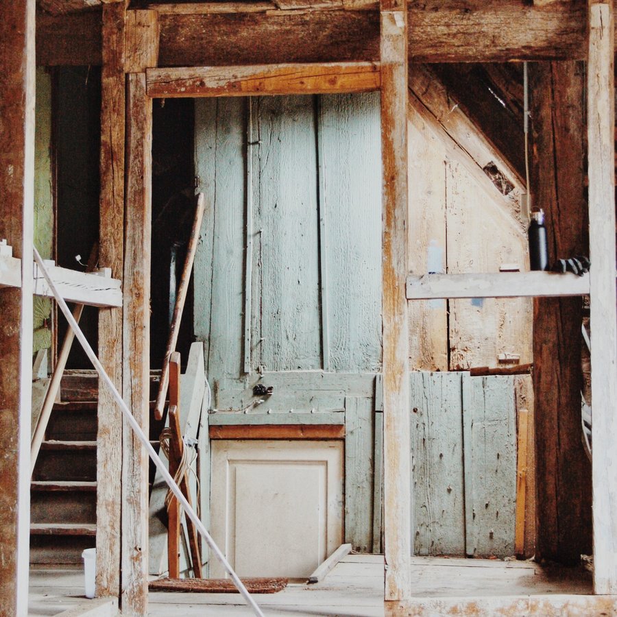 Wenn wir aktuell in dieses rohen Räumen mit den freigelegten Balken, ohne Strom, ohne Heizung aber jetzt schon mit ganz viel Charme stehen, dann können wir uns schon genau vorstellen, wo später mal unser Sofa steht und wie wir in der Küche kochen.