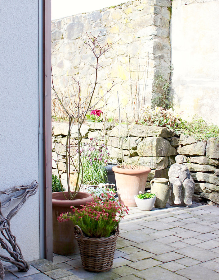 Hofterrasse, vor dem Eingang, Steinmauer, Töpfe, Blumen, Terrasse