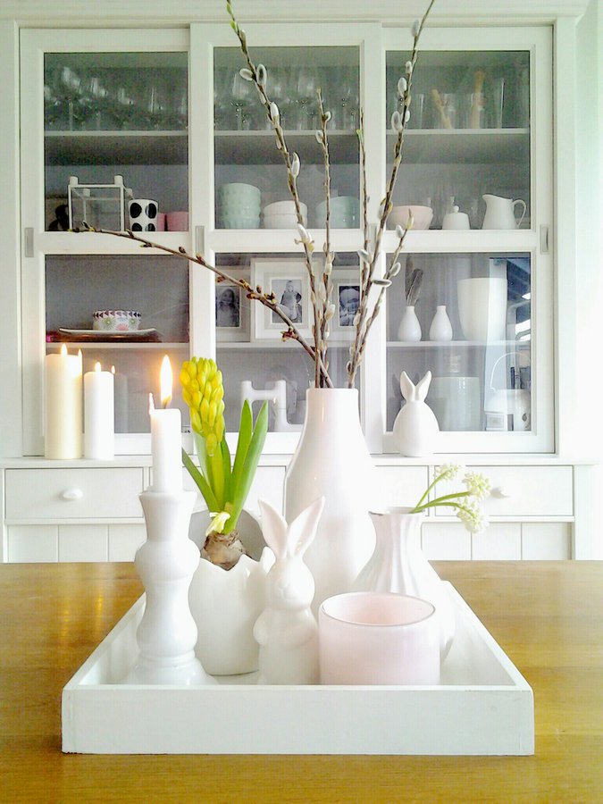 Ostern, Osterdeko, Tischdeko, Esstisch, Weiß, Frühling, Frühlingsdeko, Buffetschrank, Landhsusstil, Skandinavischer Stil, Landhausstil