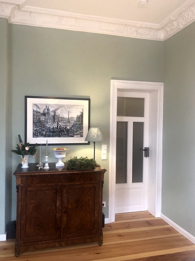 Die Lampe auf der Kommode ist übrigens eine 0815 Ikea-Lampe, allerdings habe ich den Schirm mit hochverdünnter Wandfarbe gestrichen. Mir gefällt gerade dieser Ton-in-Ton Charakter mit den Wänden.