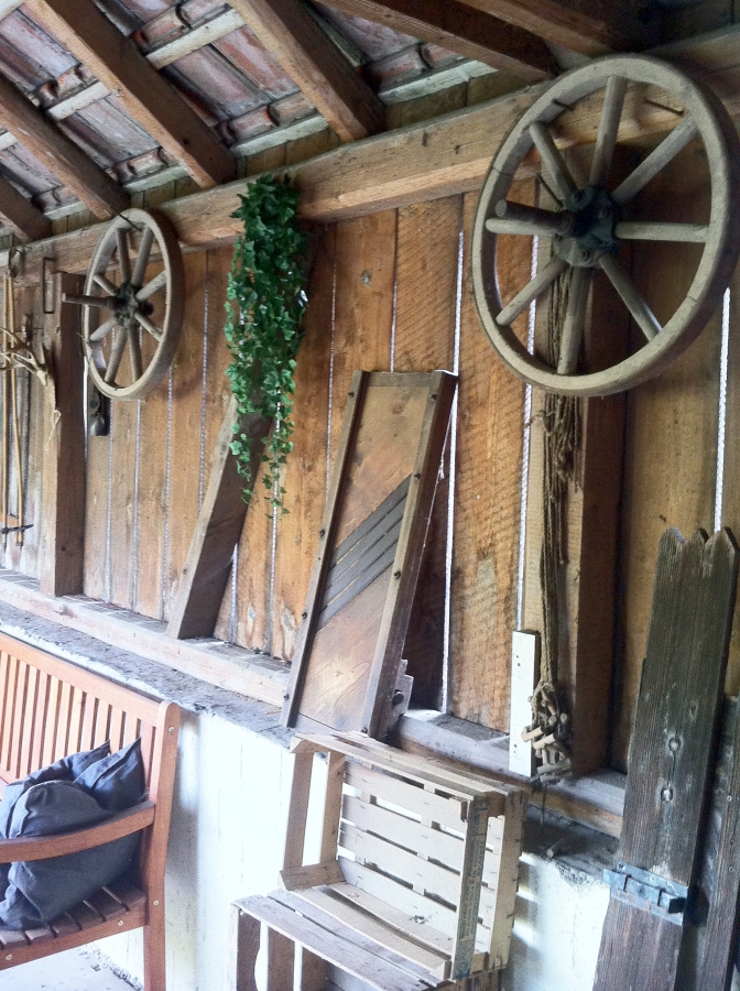 Unser überdachter Zugang und gleichzeitig die Sitzecke zwischen Haus und Bauernscheune. Alle Fundstücke der alten Scheuen bekommen hier wieder einen wohl verdienten Platz. Zu schön um im Chaos versteckt zu bleiben. Bin gespannt was wir noch so alles finden werden!
