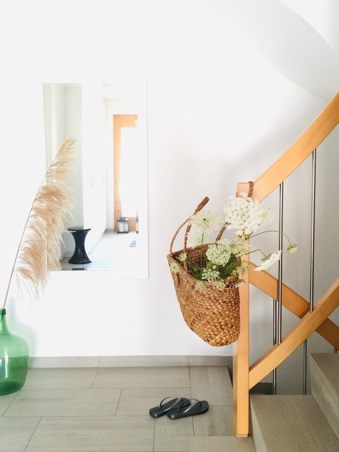 Hauseingang, Flur, Treppe, Treppenaufgang, Spiegel, Pampasgras, Wilde Möhre, Korb, Vase