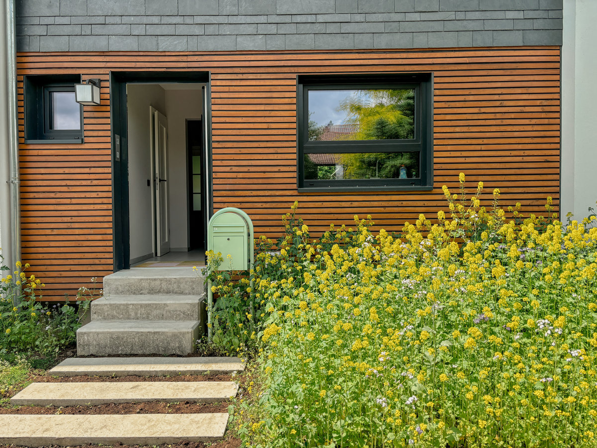 Vorgarten, beton, Treppe, Zuwegung, Fassade, Sanierung, Reihenhaus, Reihenmittelhaus, Holzfassade, Schiefer