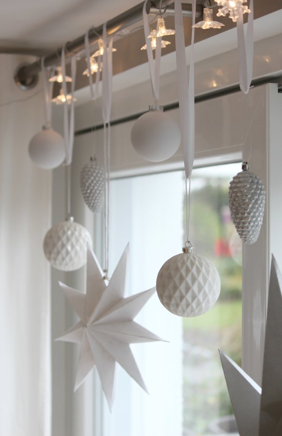 Ein paar Kugeln hängen schon, aber nur ganz schlicht in weiß. Vielleicht kommen später noch ein paar silberne dazu, wer weiß...