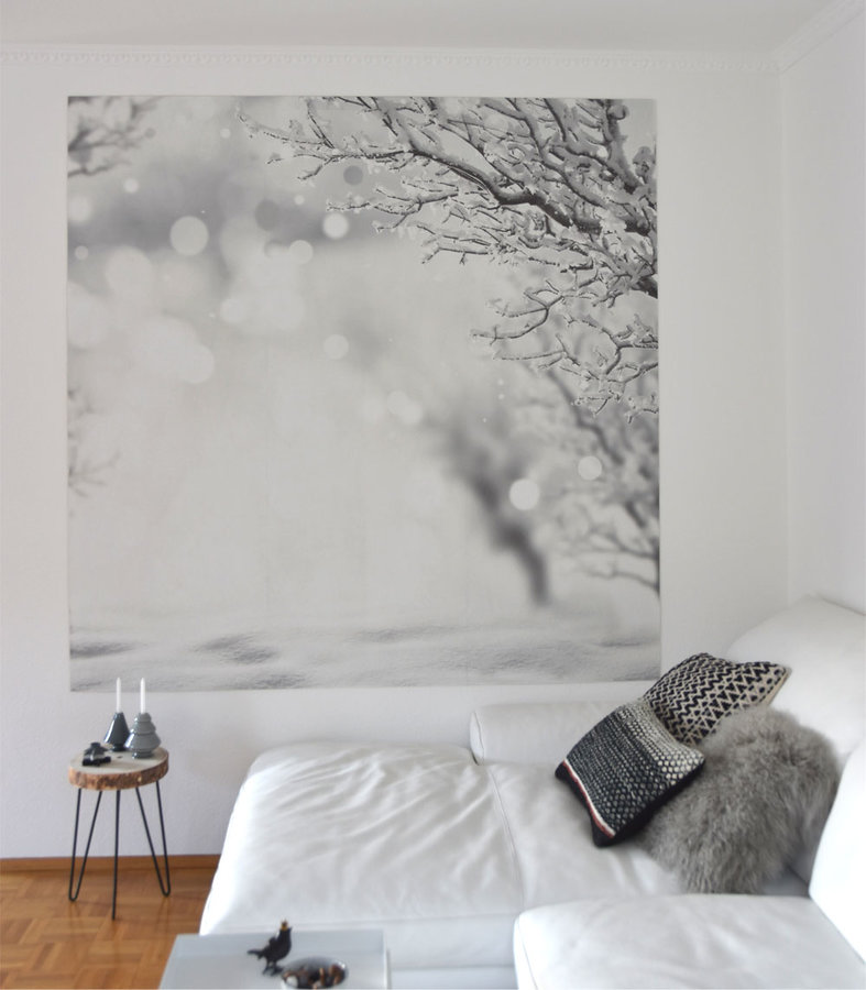 So, nun ist auch etwas Winterliches bei mir eingezogen: ein verschneiter Baum in einer winterlichen Landschaft in Grau-Tönen als Fototapete - ich finde es sooooo schön!!