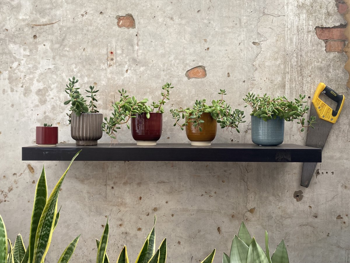 Wir haben genau zwei Regale - das aus geschwungenem Echtholz über unserm Sofa und dieses hier im Schuppen. Die Pflanzen wurden für die momentanen Renovierungsarbeiten ausgelagert. Mir gefällt der Look so gut, dass er mir ein Foto wert war. Simpel, praktisch und rustikal. 😊