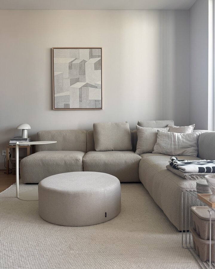 Wohnzimmer, Couch, Sofa, Beige, Pouf, Teppich, Beistelltisch