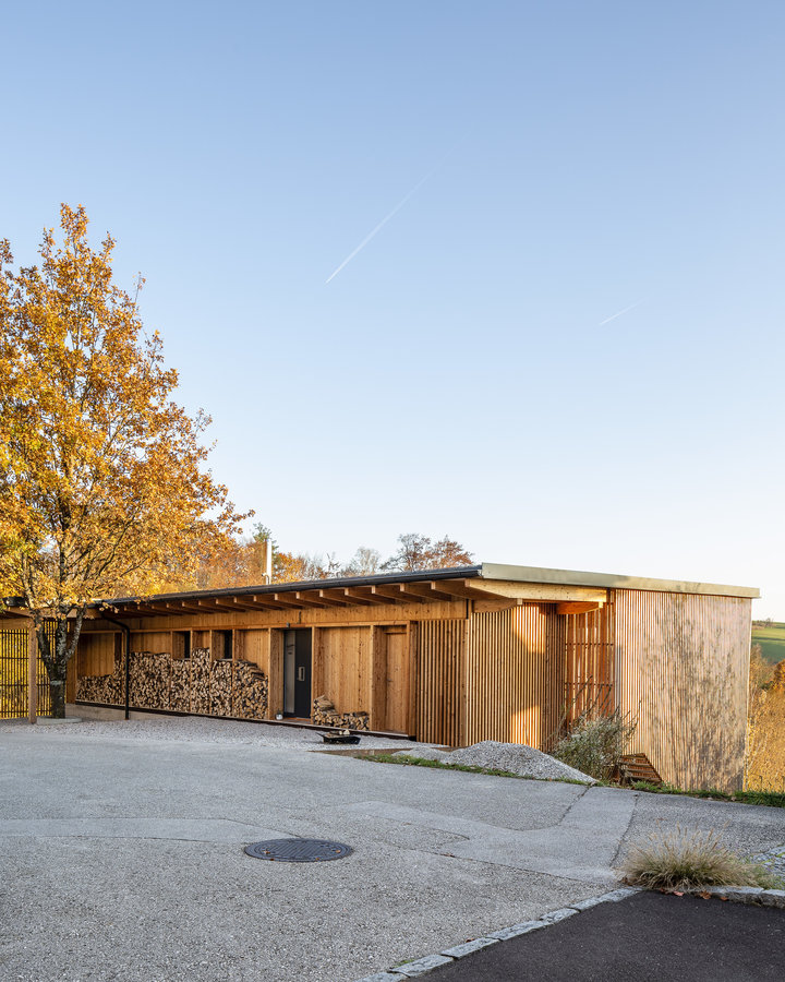 Wir haben versucht unser Haus so kompakt wie möglich zu planen. Beim Eingang haben wir uns für eine Art "Holzbilderrahmen" entschieden, dabei handelt es sich um eine Einfassung, wo genormte Holzscheite reinpassen. Die Optik ändert sich im Winter und in der kalten Jahreszeit immer, je nach Holzverbrauch und wir mussten nicht extra für Lagerraum sorgen.