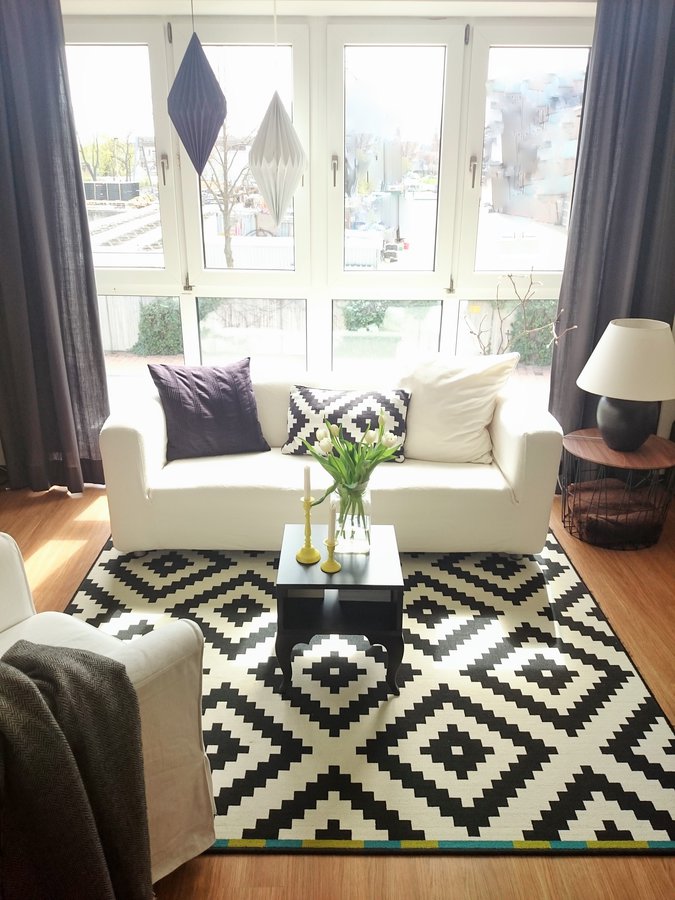 Wohnzimmer, Einzimmerappartement, Studentenappartement, Sofa Klippan, Fensterfront, LAPPLJUNG RUTA, Tulpen, Kerzenständer, Drahtkorb