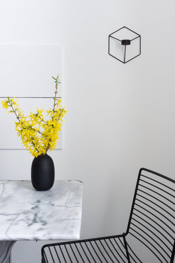 Yellow flowers, Menu POV wall candle holder, and HAY Hee dinning chair in our cozy and bright kitchen - More photos and details on my blog linked below