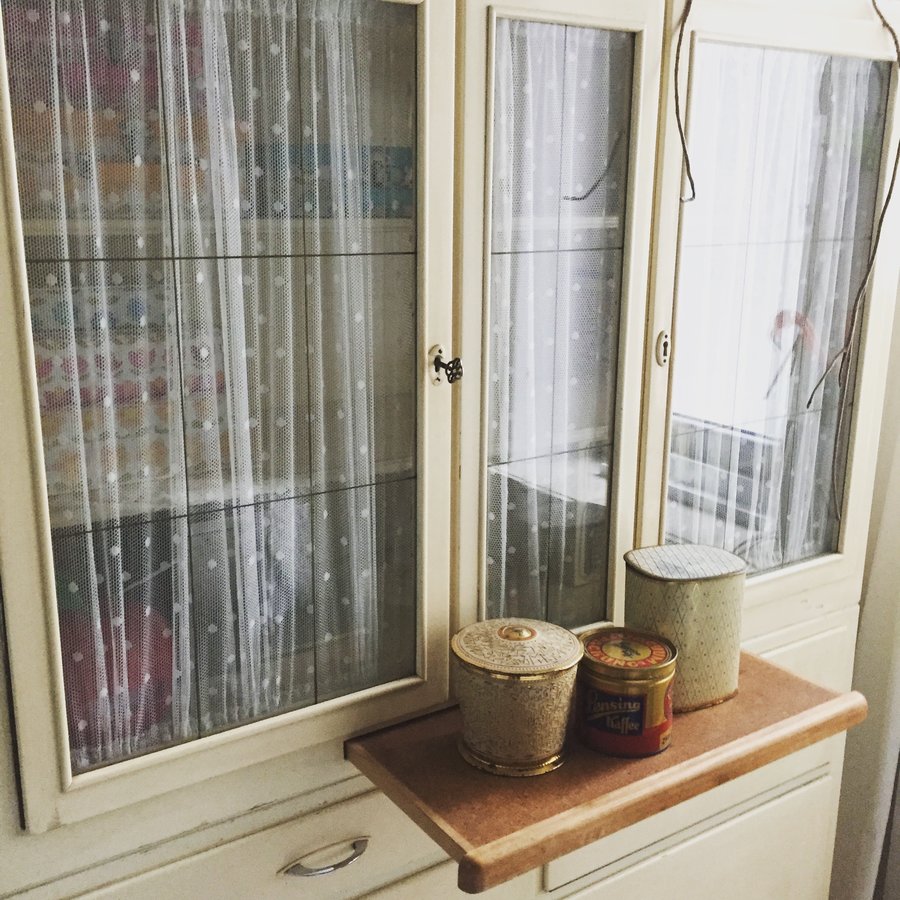 Schon vor einiger Zeit haben wir diesen wunderschönen Küchenschrank über ebay Kleinanzeigen geschossen. Er war dermaßen schmutzig, daß wir wie die Weltmeister schrubben mussten und die dazugehörigen Vorhänge waren nicht mehr zu retten. Jetzt habe ich es endlich geschafft, ihn mit zarten Pünktchentüllvorhängen auszustatten. Jetzt ist er wirklich wunderschön.
