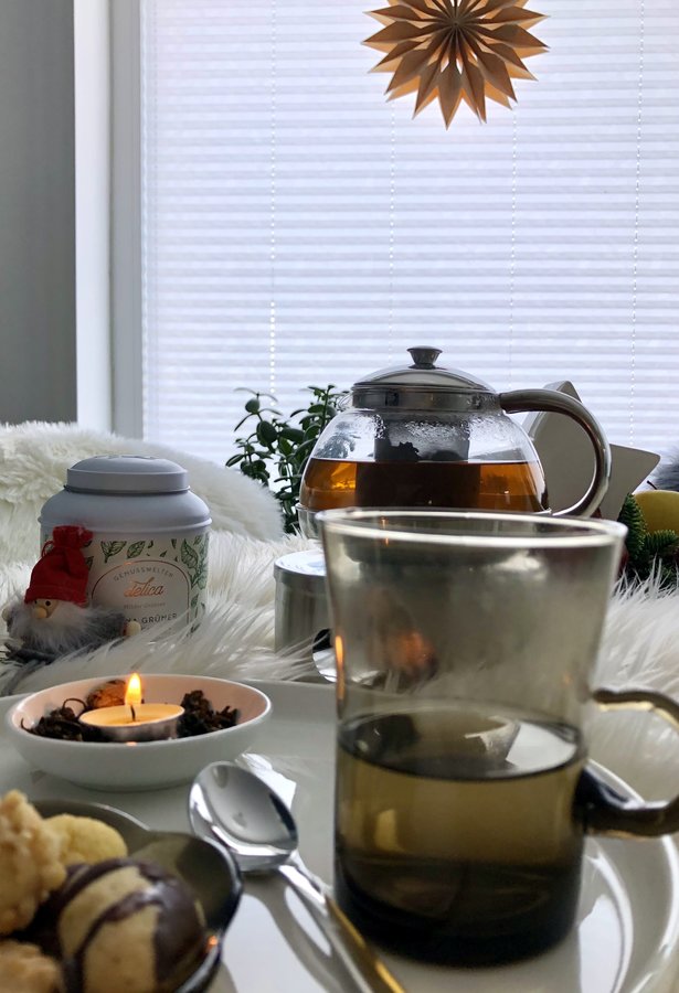 Teeglas, Keramikschälchen, Teelicht, Glasteller, Gebäck, Teekann, Glas, Stöfchen, Winterdekoration, Wichtel, Grüntee, Teedose, Essbereich, Teezeit, Gemütlichkeit