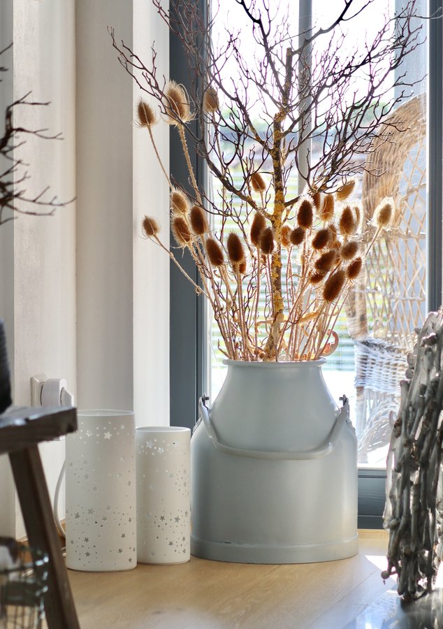 Milchkanne, Erbstück, Hommage, Wohnraum, Bank, Keramikleuchten, bodentiefes Fenster