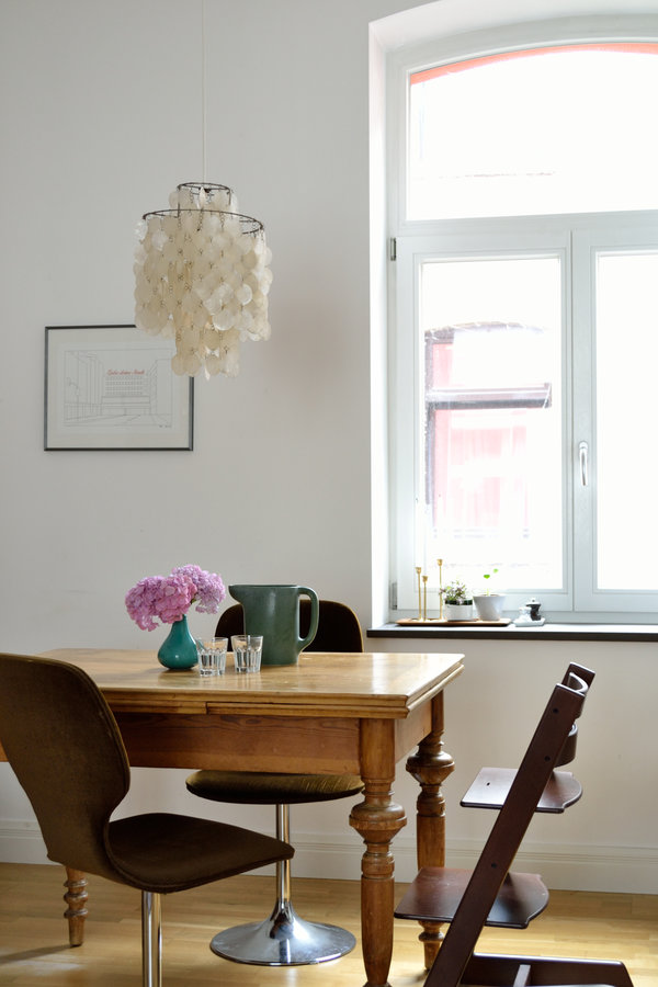 Essbereich, Esstisch, Weichholztisch, 70er Jahre Drehstuhl, Tulpenfußstühle, Tripp Trapp, Muschellampe, Liebe deine Stadt, Hortensien, sinnerlig, Stilmix