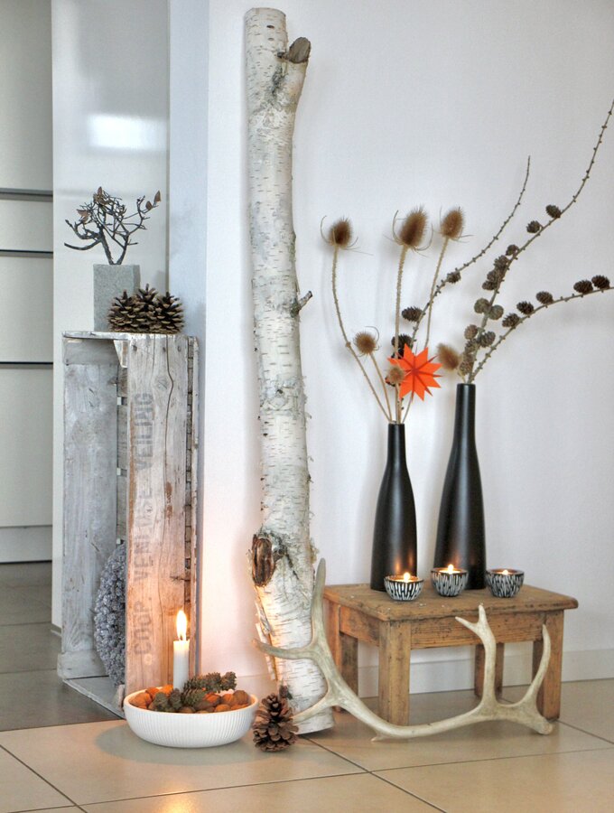 Vasenneuzugang, Holztisch, Rentiergeweih, Kerzenschale, Lärchenzweige, Kiste, Birkenstamm, 3D Stern