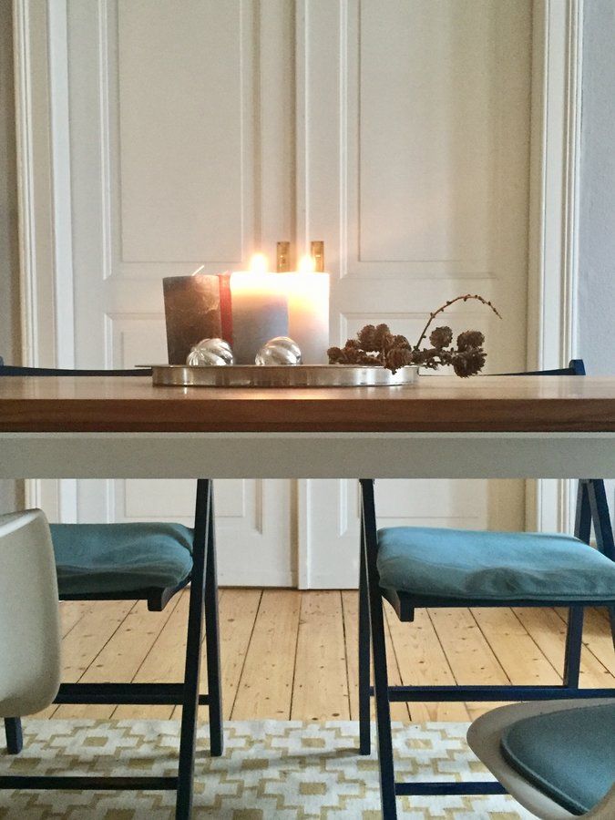 Altbauwohnung, Esszimmer, Schiebetür, zwei Kerzen brennen, zwei blaue Stühle