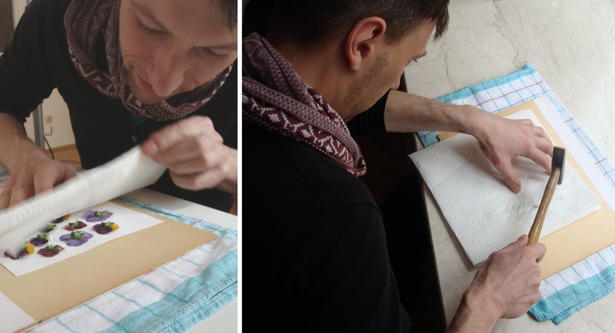 Die Blüten werden auf dem zugeschnittenen Aquarellpapier arangiert, Küchenpapier auflegen und loshämmern. Aber Achtung! Wir wollen den Tisch nicht zu Feuerholz verarbeiten. Deshalb gehen wir behutsam, aber mit Leidenschaft ans Werk. Ein wenig Geduld solltet ihr auch haben, denn man sollte schon einige Male sorgfältig über jede Blüte hämmern, damit Farbe und Form gut auf das Papier übertragen werden. Durch Lupfen der Küchentücher könnt ihr überprüfen, wie weit ihr schon seid.