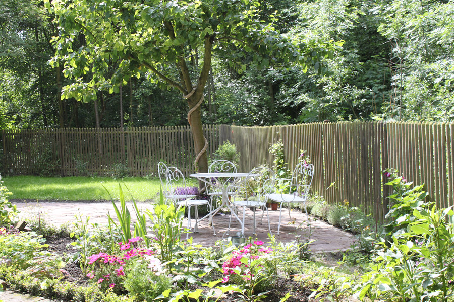 Den angelegten Bauerngarten wollten wir behalten, denn er passt zu unserem alten Bauernhaus. Der Buchs hatte einen Pilz, weshalb wir dieses Jahr über 200 neue Pflanzen setzen mussten. Die Beete sollen in Zukunft mit typischen Bauerngartenblumen bestückt sein. Im Moment sind mir dort noch zu viele Lücken. Neu gepflanzt habe ich bisher Dahlien, Rittersporn, Levkojen, Phlox, Cosmeen und Rosen. Bis die groß werden, muss ich mich allerdings noch gedulden. Auch die geppflanzten Jasminsträucher sind bisher mickrig klein, aber an Zaun und Regenrinne haben wir Clematis gesetzt, die uns schon mit schöner Blüte erfreut haben. Einen Teil des Gartens haben wir erst neu erschlossen. Dazu mussten wir einen Bereich des angrenzenden Grundstücks, das einem undurchdringlichen Urwald ähnelte, aufarbeiten und Bäume und Sträucher mit dem Minibagger entfernen lassen. Einen alten Holunderbaum und den Apfelbaum haben wir stehen gelassen und uns entschieden, um den Apfelbaum eine Terrasse anzulegen, die erst vor kurzem fertig gestellt wurde.