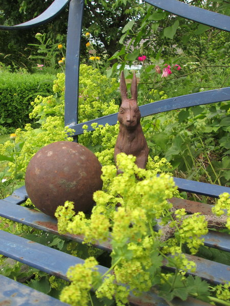Ein bisschen Deko muss sein: Ein Hase aus rostigem Eisen wacht über den Garten