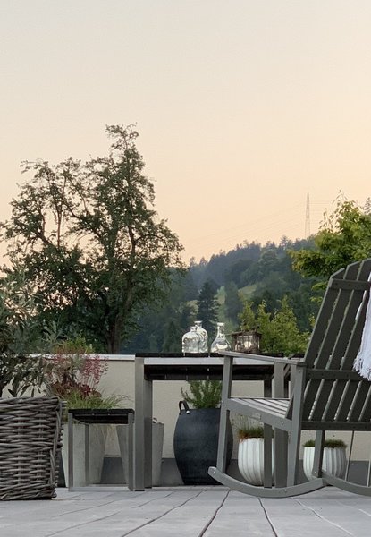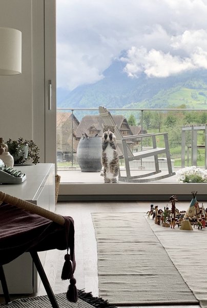 Die Wohnung ist mein Rückzugsort. Wenn ich auf dem Sofa liege und Baumwipfel sowie Bergspitzen sehe, fühle ich mich ein wenig wie in einem hoch gelegenen Nest. Das gibt mir Geborgenheit und Sicherheit. Ich bin sehr empfindsam und froh, dass der Blick in die Natur mit ihren veränderlichen Stimmungen mich zu erden vermag. Diese direkt vor den Fenstern vorzufinden ist ein Geschenk! Die Räume sind zudem natürlich auch mein persönliches Experimentierfeld.