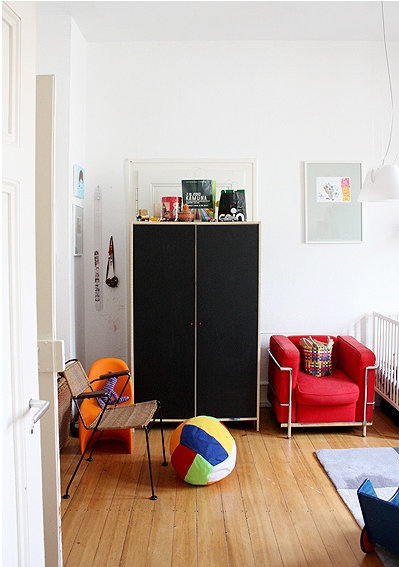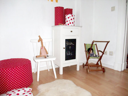 Das Kind sollte sich ausleben dürfen, aber an einer Stelle, mit der alle zufrieden waren. Hier kam die Tafelfolie zum Einsatz. Ein alter Hocker war unser erstes Objekt, das wir mit schwarzer Tafelfolie kostümierten. Der kleine Maltisch war fortan sehr beliebt und erfreute sich häufigen Gebrauchs. Der schwarze Akzent zwischen all dem Bunten unserer Wohnung gefiel uns – ein schöner Kontrast!