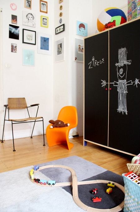 Und so überlegten wir, ein weiteres, aber größeres Objekt mit Tafelfolie zu verblenden – den Kinderzimmerschrank. Die schwarzen Türen sind auch in unbemaltem Zustand eine Augenweide. Wenn Freunde der Kinder da sind, wird gemeinsam gemalt und gemalt, bis der ganze Schrank von oben bis unten voll ist. Das sieht toll aus und macht Kindern einen Heidenspaß.