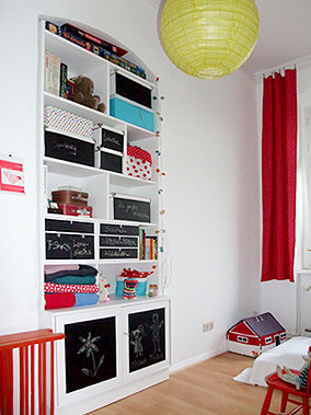 Mitglied Cathinca hat ihr Regal im Arbeitszimmer mit zwei Schiebetüren versehen, die mit Tafelfolie beklebt wurden. So kann Tochter Annabelle während Mama arbeitet werkeln.