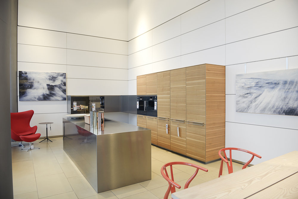 Große, moderne Küche und Kücheninsel mit metallener Beschichtung