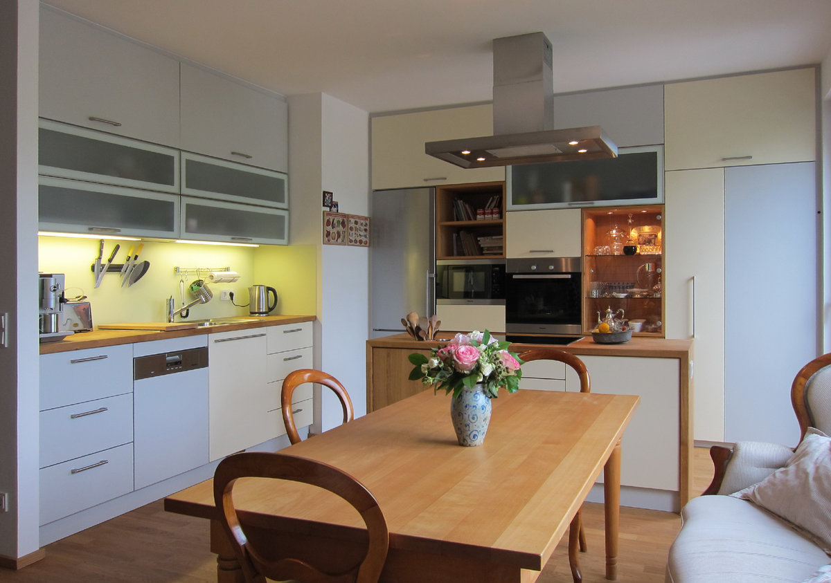 Die Küche sollte in dem offenen Wohnraum nicht zu funktional wirken, daher wurde der Vorbereitungs- und Spülbereich in einer aus dem Wohnraum nicht einsehbaren Nische eingebaut. In den Oberschränken darüber sind in den unteren Fächern Gläser und Geschirr untergebracht, in den oberen Fächern ist Platz für selten genutzte Teile. Einbauleuchten in der Unterseite der Oberschränke sorgen für gezieltes Licht auf der Arbeitsfläche. Die Wandflächen zwischen Arbeitsfläche und Oberschränken sind mit rückseitig lackiertem, mattiertem Glas belegt.
