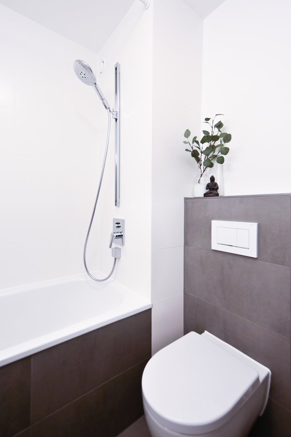 Schickes Wohlfühlbad mit viel Holz und Fliesen in Betonoptik