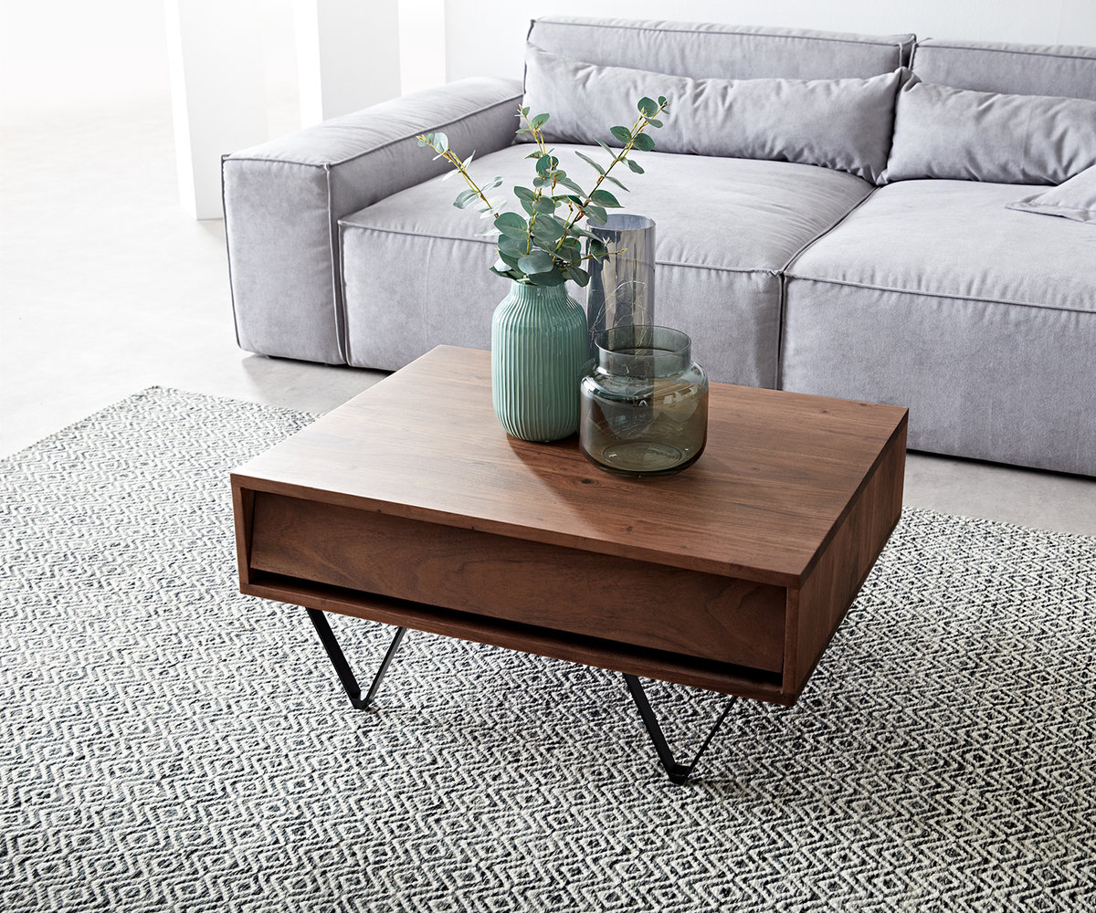 Mit einem matten Braunton verfeinert wirkt das Holz noch edler. Kompakter Couchtisch mit zwei Schubfächern.