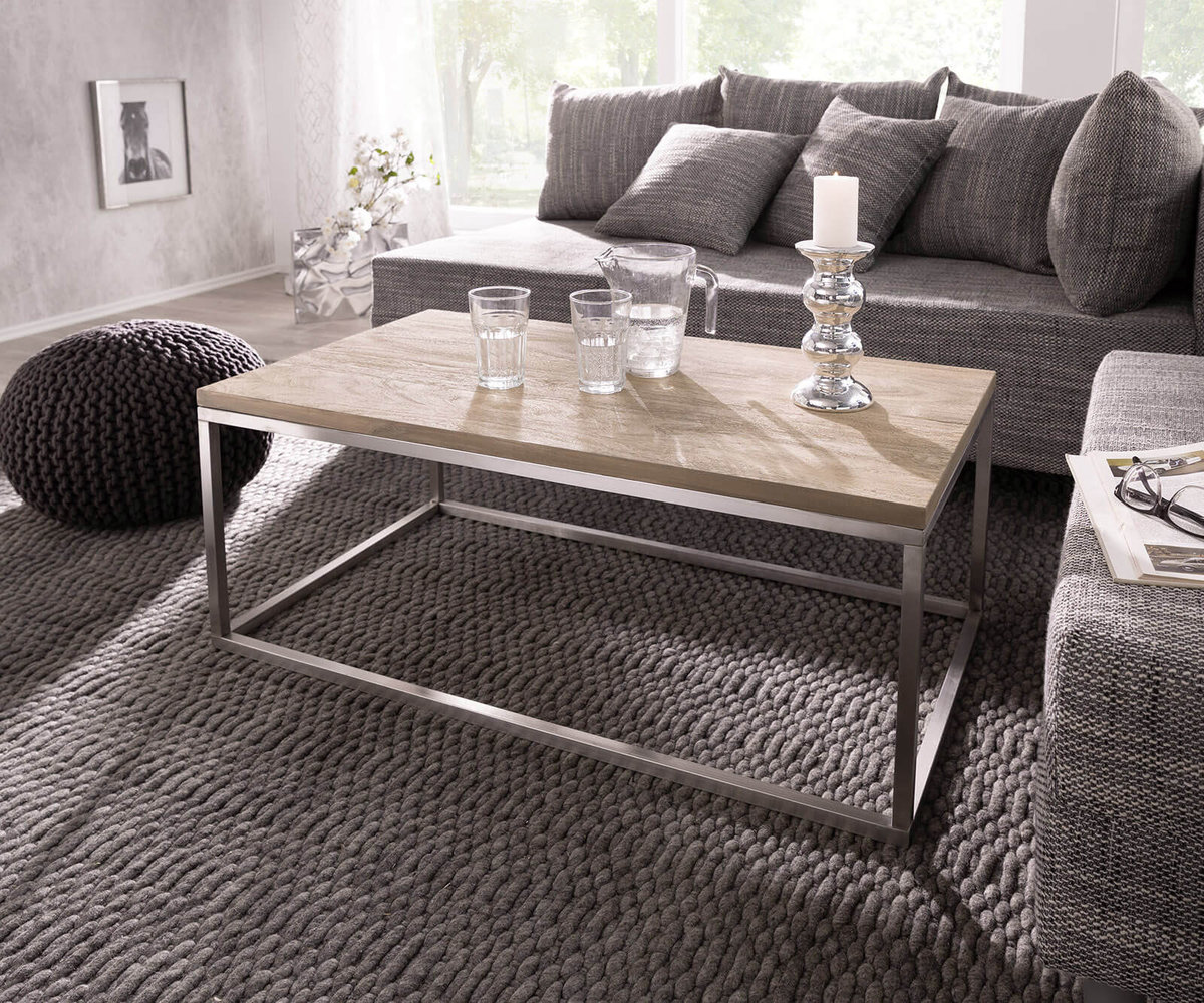 Der zeitlose Wohnzimmertisch Tatius ist eine Kombination aus klassischem Holztisch und modernem Design Tisch. Die Materialien Massivholz und Edelstahl verbinden sich in seinem Design zu einer ebenso funktional wie auch ästhetisch ansprechenden Konstruktion im Stil des Industrial Styles.