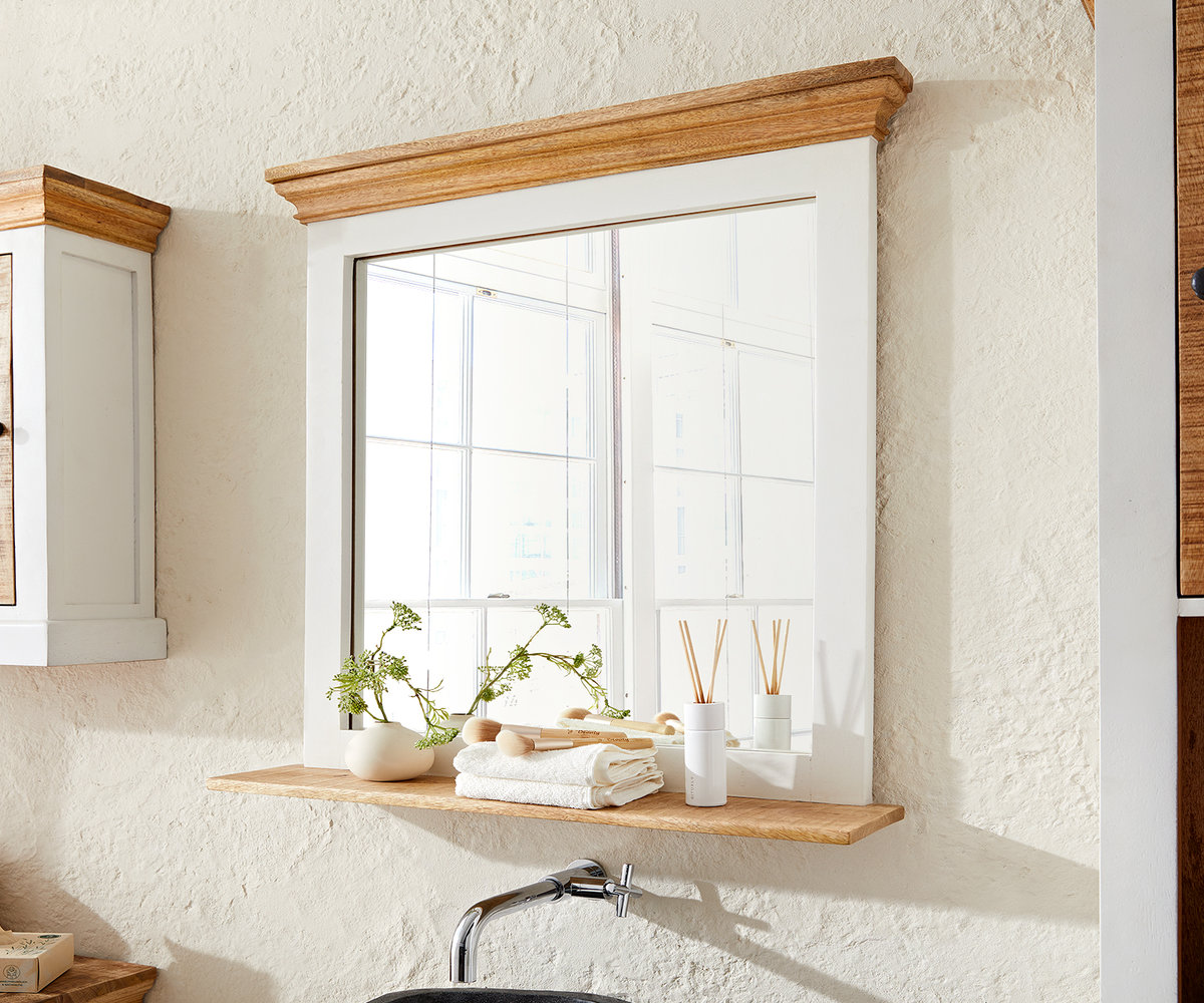 Aus erlesenem Massivholz - Der Spiegel CasaAuf der naturbelassenen Ablagefläche, mit der der Badspiegel ausgestattet ist, kann die schöne Maserung des Massivholzes betrachtet werden. Das edle Mangoholz, das die Spiegelfläche rahmt, ist hingegen weiß lackiert - ein natürlich und freundlich anmutender Kontrast.