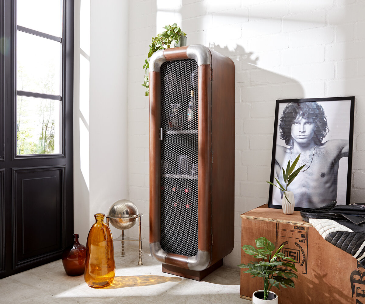 Tauche ein in den Charme vergangener Zeiten mit diesem Barschrank im Shabby Chic Stil. Die braune Farbe verleiht diesem Stück seinen einzigartigen Charakter. Hier wird die Schönheit des Unperfekten gefeiert: Rostoptik und Dellen sind keine Makel, sondern erzählen Geschichten und geben dem Möbelstück eine lebendige Ausstrahlung. Ein besonderes Highlight ist die Tür mit Gitter statt Glas, durch die man einen Blick ins Innere werfen kann.