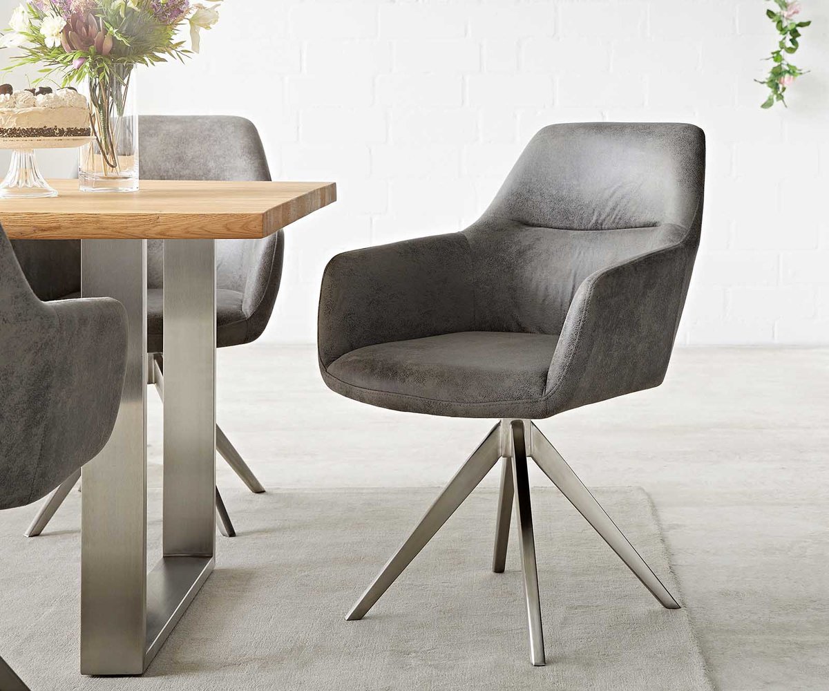 Die Sitzschale Pejo ist durch ihr klassisches Design mit durchgehenden Armlehnen ganz besonders bequem. Die hochwertige Ziernaht an der Rückenlehne macht sie zu einem edlen Hingucker.Mikrofaser ist ein idealer Bezugsstoff für moderne Stuhldesigns. Das Material sieht nicht nur zeitlos schön aus, es ist zudem angenehm weich und gleichzeitig extrem robust und leicht zu reinigen.Esszimmerstuhl Pejo Mikrofaser Grau Antik - die perfekte SitzgelegenheitDas Stuhlgestell mit Rückholfunktion verfügt über eine auffällige Kreuzform und lässt sich bequem bis zu 180 Grad drehen.Das Stuhlgestell wurde aus hochwertigem, handgebürstetem Edelstahl hergestellt. Durch das Bürstenverfahren glänzt das Gestell in edler Optik und ist besonders widerstandsfähig gegen Rost und Verschleiß.