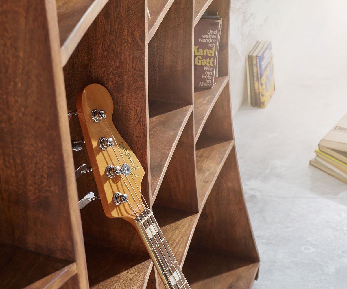 Das Standregal besteht aus massivem Akazienholz in einer braunen Farbgestaltung. Die einzelnen Fächer sind unterschiedlich groß und lockern das Gesamtbild auf. Auch Ordner oder Unterlagen können in dem Bücherregal problemlos verstaut werden.