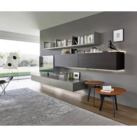 Alle Elemente kommen bereits vormontiert, die Wohnwand muss nur noch in der richtigen Reihenfolge an die Wand gehangen werden. Einzelne Elemente können auch in der Position verschoben werden. Bitte nutzen Sie Dübel je nach Wandbeschaffenheit.